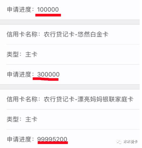 对于农行申请进度查询可见进度,不同进度代码都代表办卡进度,比如300000 代表“收到资料待审核”更多农行申请代码可木木说卡公众号后台回复“农行进度”查看